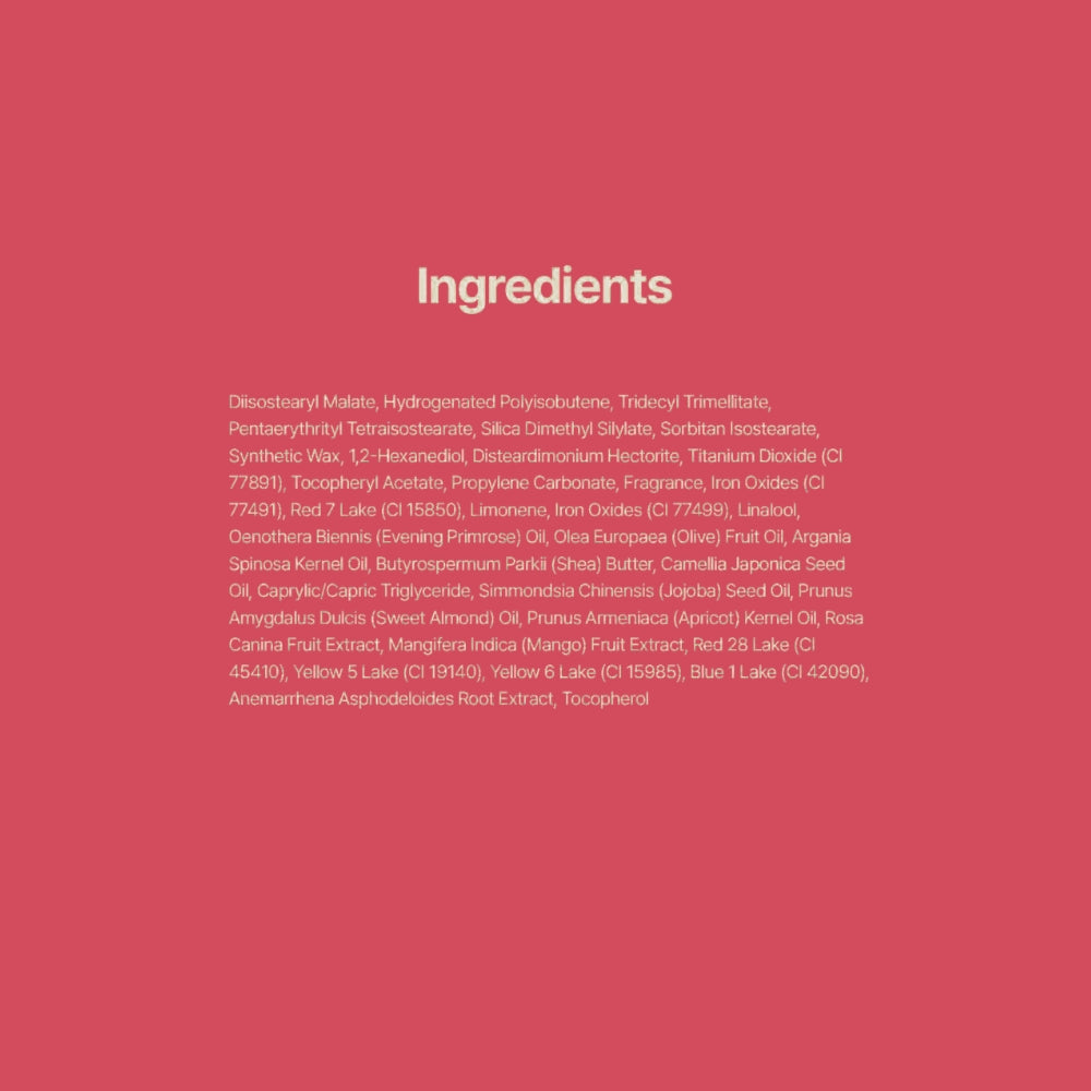 Diisostearyl Malate, Hydrogenated Polyisobutene, Tridecyl Trimellitate, Pentaerythrityl Tetraisostearate, Silica Dimethyl Silylate, Sorbitan Isostearate, Synthetic Wax, 1,2-Hexanediol, Disteardimonium Hectorite, Titanium Dioxide (Ci 77891), Tocopheryl Acetate, Propylene Carbonate, Fragrance, Iron Oxides (Ci 77491), Red 7 Lake (Ci 15850), Limonene, Iron Oxides (Ci 77499), Linalool, Oenothera Biennis (Evening Primrose) Oil, Olea Europaea (Olive) Fruit Oil, Argania Spinosa Kernel Oil, Butyrospermum Parkii (Shea) Butter, Camellia Japonica Seed Oil, Caprylic/Capric Triglyceride, Simmondsia Chinensis (Jojoba) Seed Oil, Prunus Amygdalus Dulcis (Sweet Almond) Oil, Prunus Armeniaca (Apricot) Kernel Oil, Rosa Canina Fruit Extract, Mangifera Indica (Mango) Fruit Extract, Red 28 Lake (Ci 45410), Yellow 5 Lake (Ci 19140), Yellow 6 Lake (Ci 15985), Blue 1 Lake (Ci 42090), Anemarrhena Asphodeloides Root Extract, Tocopherol