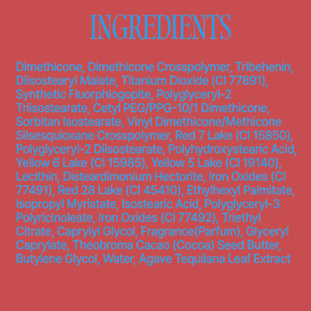 Dimethicone, Dimethicone Crosspolymer, Tribehenin, Diisostearyl Malate, Polyglyceryl-2 Triisostearate, Synthetic Fluorphlogopite, Titanium Dioxide (CI 77891), Theobroma Cacao (Cocoa) Seed Butter, Agave Tequilana Leaf Extract, Cetyl PEG/PPG-10/1 Dimethicone, Sorbitan Isostearate, Vinyl Dimethicone/Methicone Silsesquioxane Crosspolymer, Polyhydroxystearic Acid, Polyglyceryl-2 Diisostearate, Disteardimonium Hectorite, Ethylhexyl Palmitate, Isopropyl Myristate, Isostearic Acid, Lecithin, Polyglyceryl-3 Polyricinoleate, Triethyl Citrate, Caprylyl Glycol, Glyceryl Caprylate, Butylene Glycol, Water, Fragrance, Iron Oxide Red (CI 77491), Lithol Rubine BCA (CI 15850), Tartrazine (CI 19140), Iron Oxide Yellow (CI 77492), Iron Oxide Black (CI 77499)